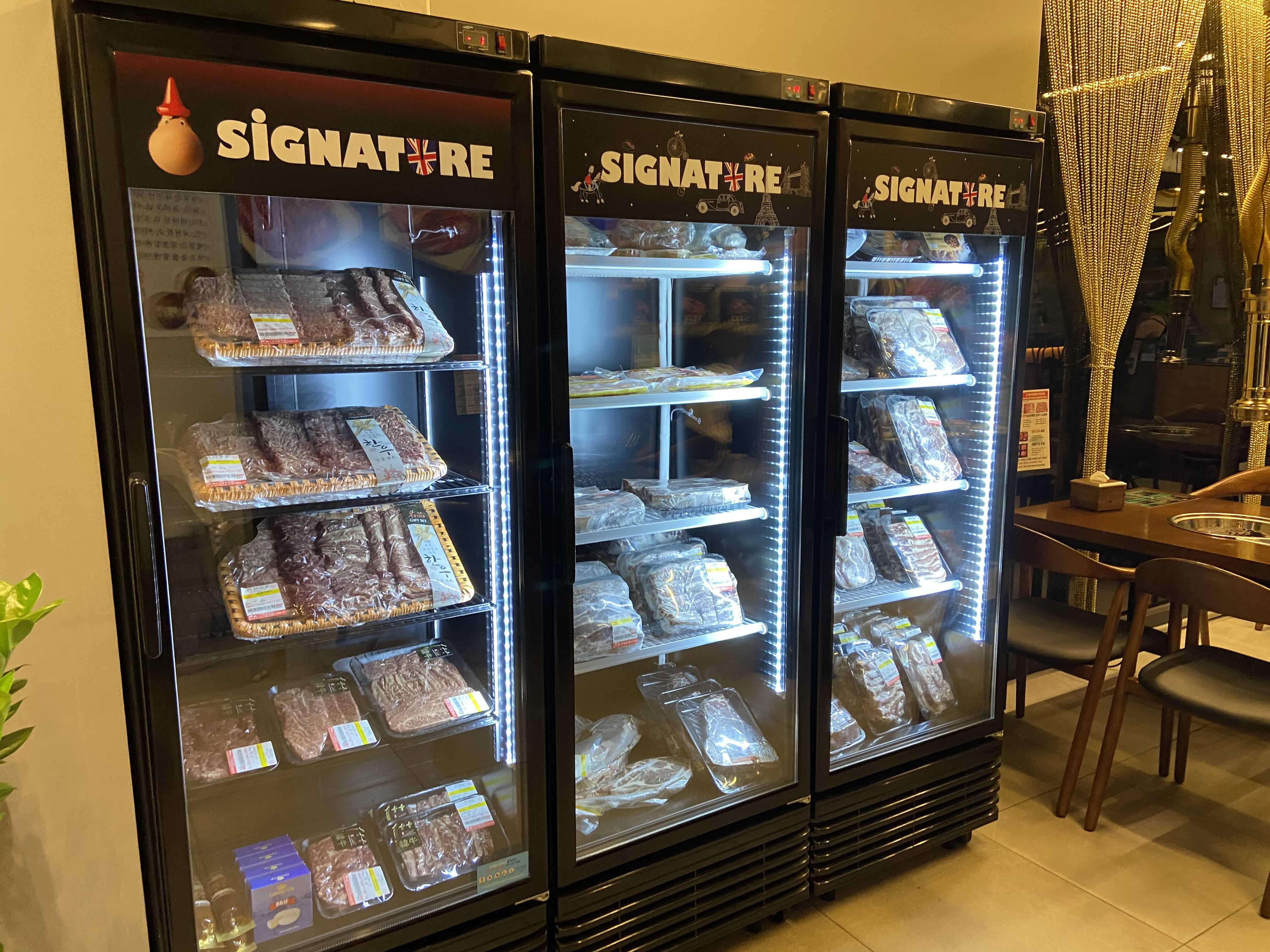 입구에 고기 냉장고들이 놓여있어요